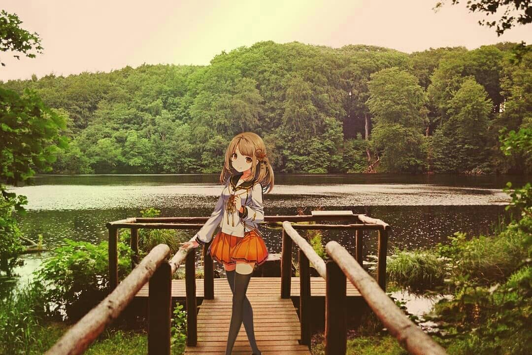 Eu acho esse tipo de imagem bem reconfortante por algum motivo, meninas de anime desenhadas sobre fotos da vida real, mais especificamente em imagens como esta. Eu amo a noite e a manhã, e amo neblina — por algum motivo, neblina de manhã me lembra a infância.