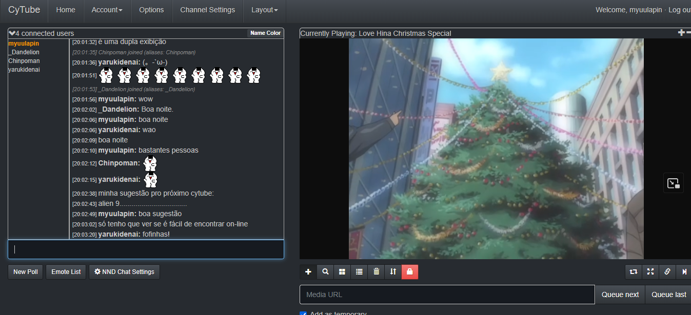 De novo, o pico foi 4 usuários, mantendo-se estável durante as duas exibições. Vamos nos encontrar em janeiro e dar o nosso melhor (com mais usuários, esperançosamente).